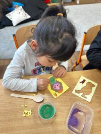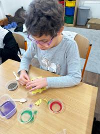 V praktické části si žáci osvojili bezpečné používání ostrého nástroje (párátko) určeného k odlupování vrstev obrázku. Tato činnost vyžadovala nejen jemnou motoriku, kterou si díky pečlivé práci výrazně zlepšili, ale také preciznost při manipulaci s pískem. Při sypání písku na jednotlivé části obrázku žáci prokázali kreativitu a fantazii, když si sami vybírali barevné kombinace. Celý proces pískování je zároveň učil trpělivosti a soustředění, což jsou dovednosti, které jim budou užitečné i v dalších oblastech vzdělávání. Každý žák pracoval svým tempem, s dopomocí lektora a učitele s ohledem na svůj handicap.