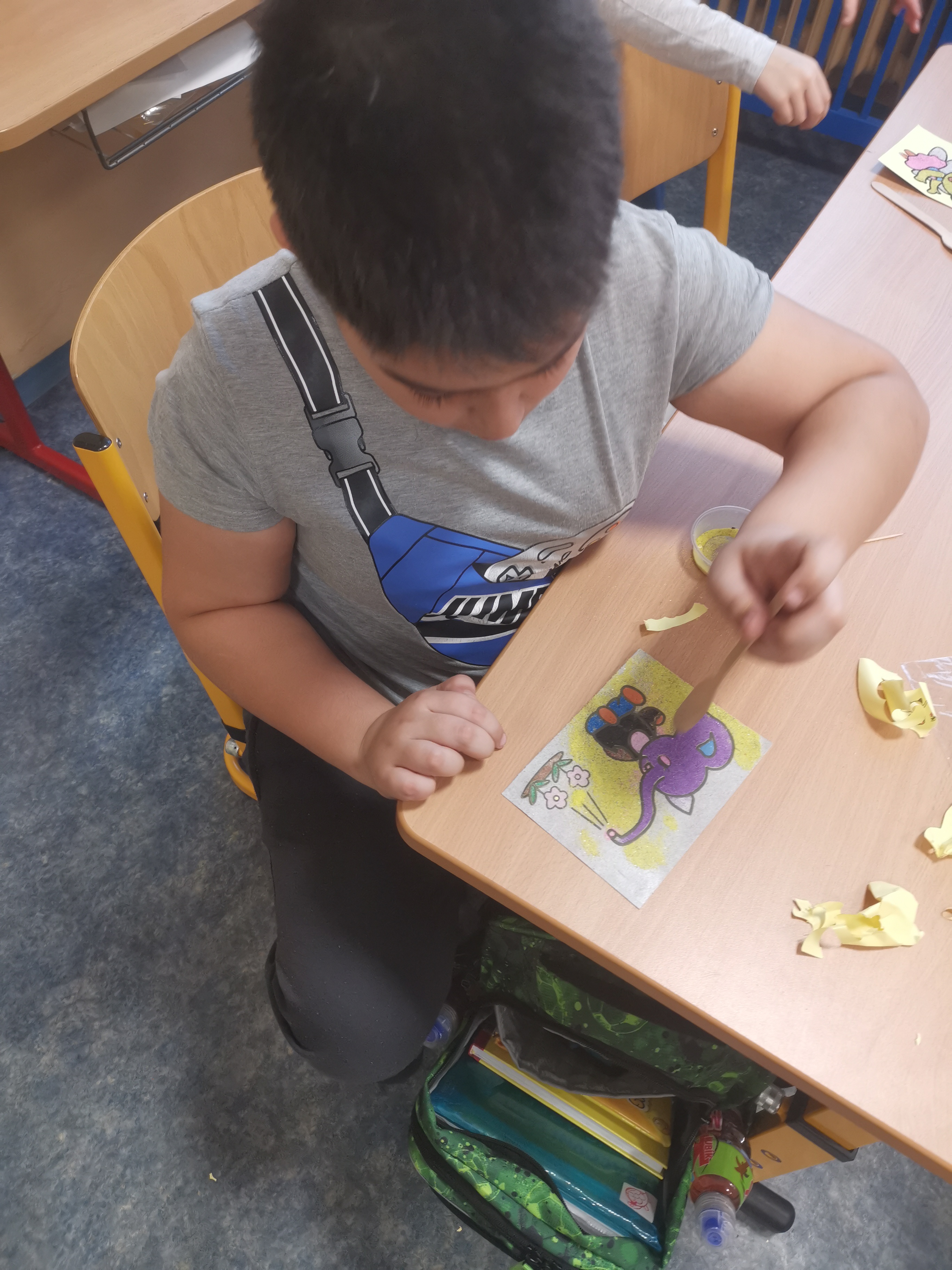 V praktické části si žáci osvojili bezpečné používání ostrého nástroje určeného k odlupování vrstev obrázku. Tato činnost vyžadovala nejen jemnou motoriku, kterou si díky pečlivé práci výrazně zlepšili, ale také soustředěnost při manipulaci. Dále museli být opatrní při přenášení písku a dodržovat ohleduplnost vůči ostatním spolužákům. Při sypání písku na jednotlivé části obrázku žáci zapojili kreativitu a představivost, když si sami vybírali barevné kombinace. Každý si vyrobil originální a jedinečný výtvor, který vypovídal o jeho fantazii.