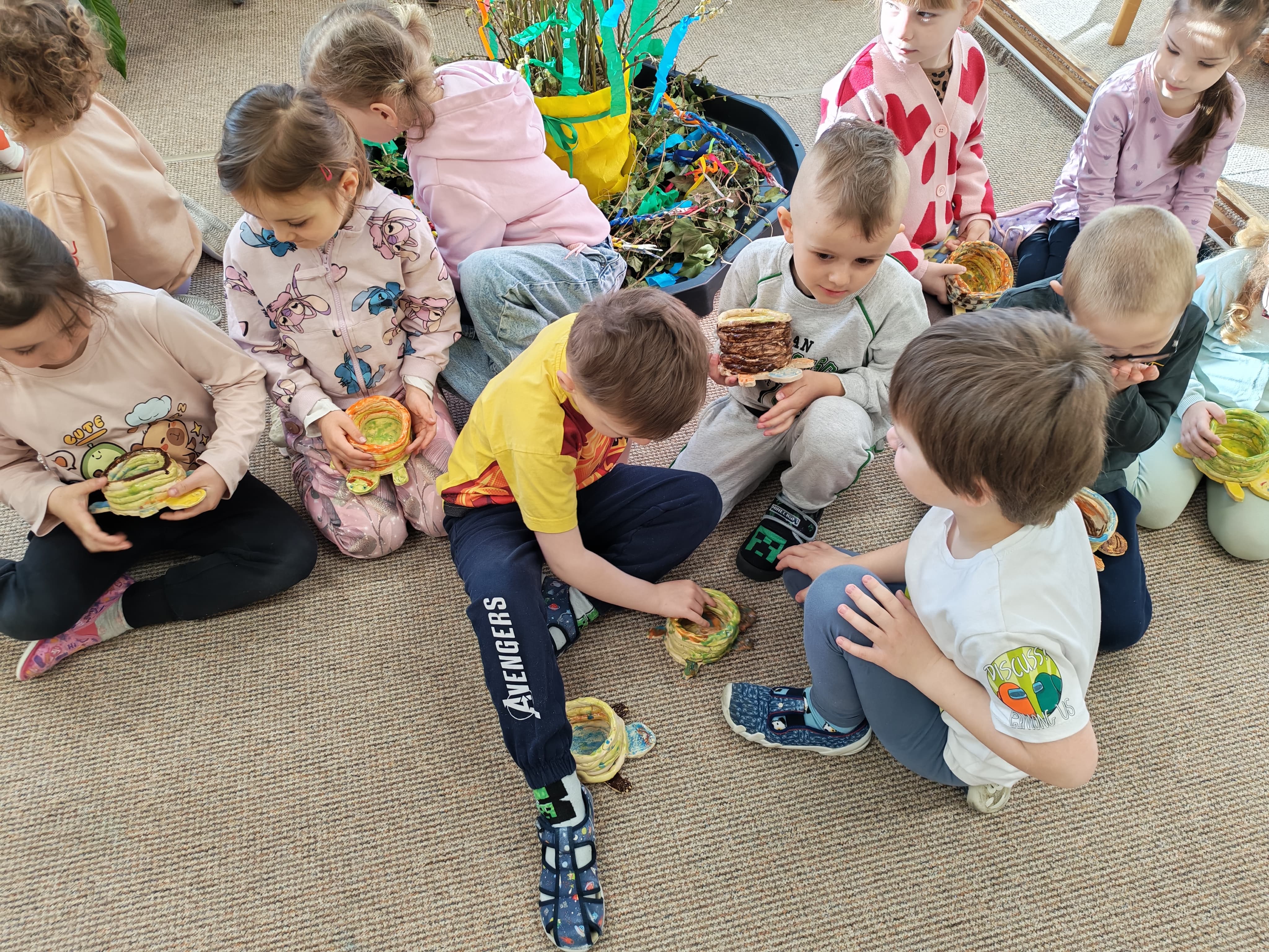 Lekce byla tentokrát výtvarného charakteru. Děti si v minulé lekci z keramické hlíny vyrobily želvičku s obráceným krunýřem (na vajíčka a osení) a na této lekci měly za cíl výtvor naglazovat a naoxidovat.
